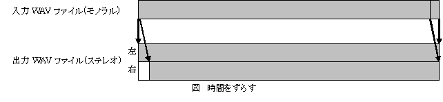 モノラルのWAVファイルをステレオのWAVファイルへ変換します.アルゴリズムは非常に簡単で,左右のチャンネルに微妙な時間差を与えるだけです.以降に処理概要を示します.