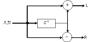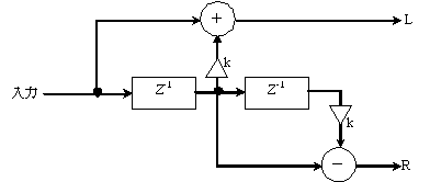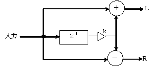 遅れた音と係数を乗算し合成,左チャンネルには加算,右チャンネルには減算