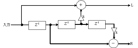 前節のプログラムに更に改良を加え,さらに左右のチャンネルの時間的ズレを多くします.以降にブロック図とインパルス応答を示します.