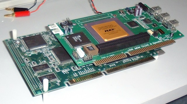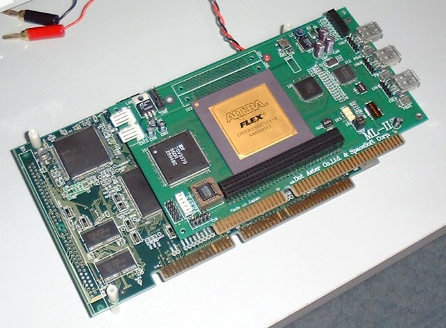 ML-IIとCQ社のVr4300を直結した様子.上部がML-II,下部のボードがCQ社のVr4300 CPUボードです.